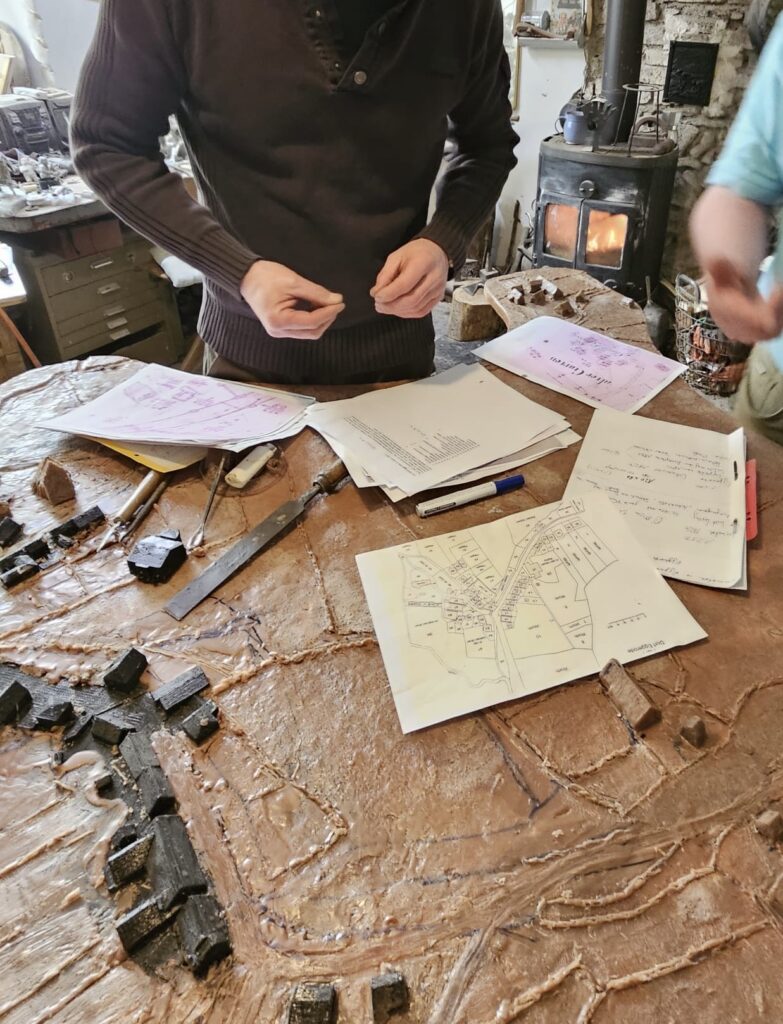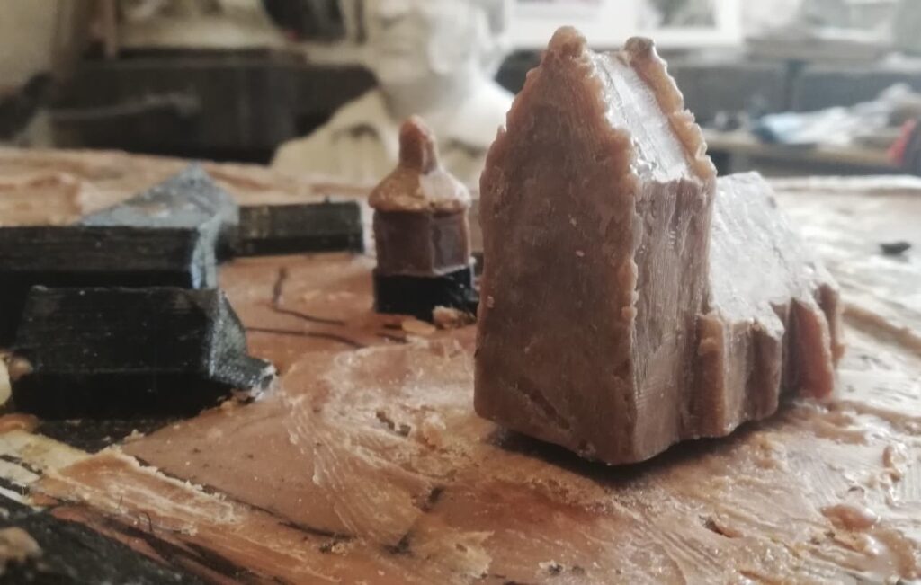 Mit viel handwerklichem Geschick wurden Gebäude, Wege und Strukturen Stück für Stück nachgebildet – die Grundlage für den späteren Bronzeguss.